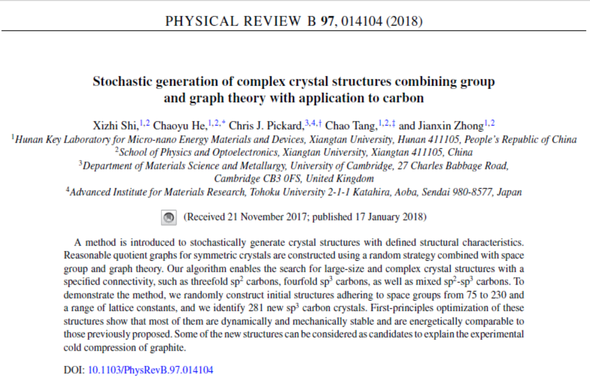 度上取决于描述材料所选用的理论工具。晶体结构是对晶体材料进行描述的重要数学模型,在对材料的认知和开发应用中发挥了重要作用。商图是描述晶体材料的一种先进数学模型,课题组近年来对商图在晶体结构预测中的应用进行了系统研究,并结合群论、图论和随机策略发展了全新的晶体结构搜索方法和软件RG2(2020SR0295721),为计算凝聚态物理和计算材料科学中的晶体结构预测贡献了新的思想、方法和工具,取得众多创新性研究成果。